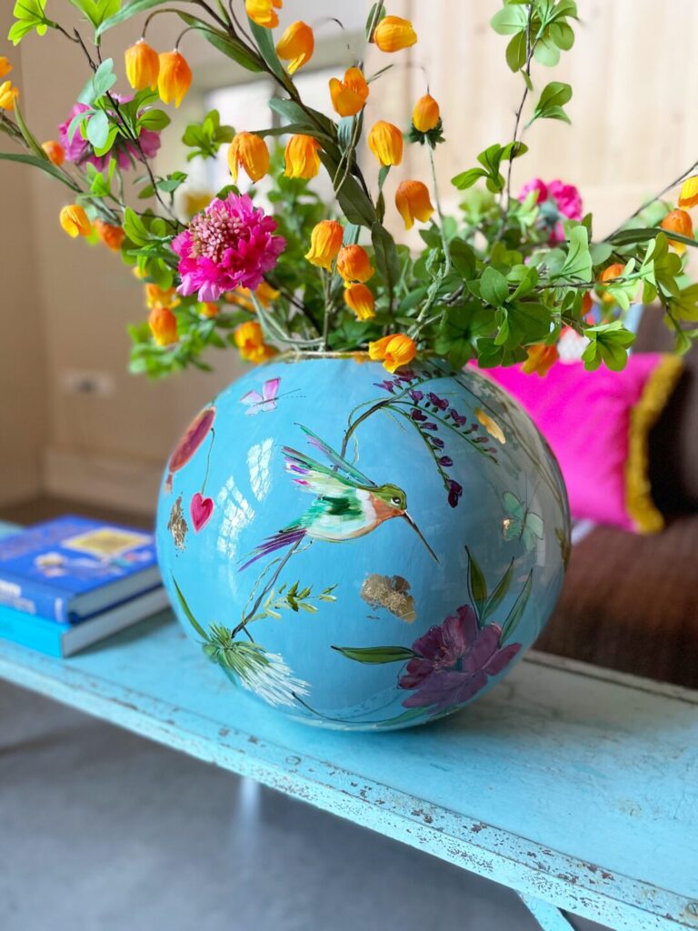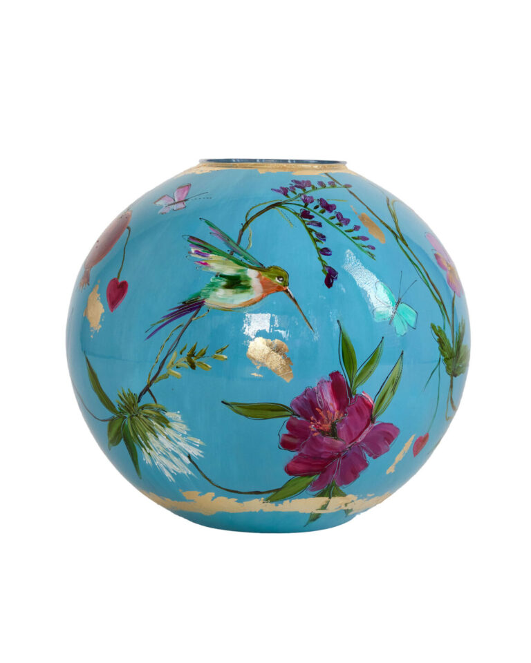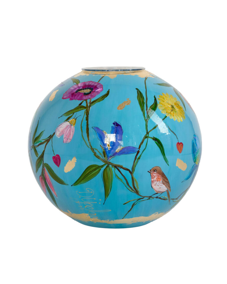 “Capri Blue” is een vaas met zowel vogels, als vlinders en bloemen. Wat wil je nog meer?! Dit allemaal op een ondergrondkleur, zo blauw als een zonnige nazomerdag. – Doortje IJpelaar
