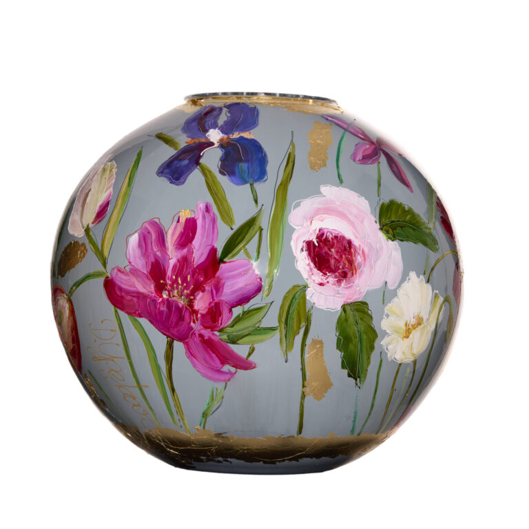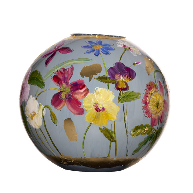 “Floral Sky” is een vaas die net als vaas “Floral White” bestaat uit een geschilderd assortiment aan veldbloemen. Het bijzondere aan deze vaas is de grijsblauwe ondergrondkleur in combinatie met de kleuren van het weelderige boeket van o.a. Viooltjes, Irissen en Pioenrozen. – Doortje IJpelaar