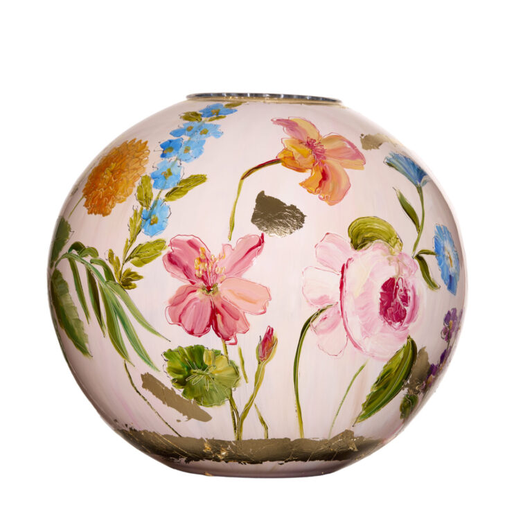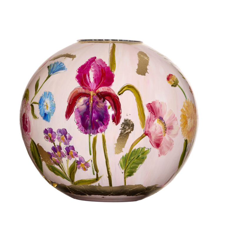De vaas “Floral White” uit mijn nieuwste collectie is een net een groot bloemenveld met allerlei soorten bloemen als een Iris, Ridderspoor en mijn favoriet; de pioenroos. Door de frisse gemêleerde ondergrondkleur van lichte beige en roze tinten, springen de bloemen er echt uit! – Doortje IJpelaar