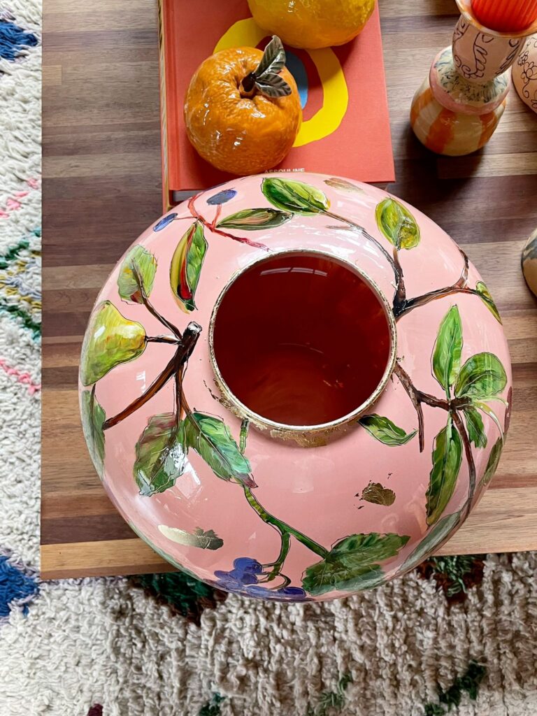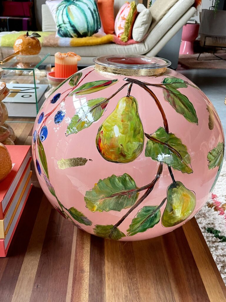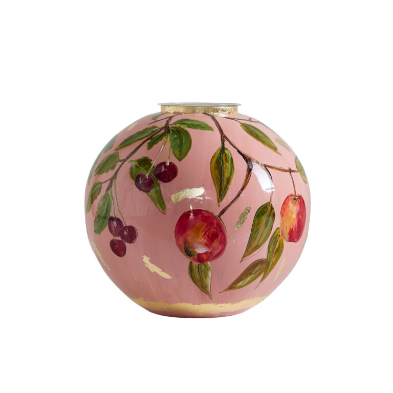 Fruits is een vaas met een lichtroze/terra ondergrond kleur. De peren, kersen en appels geven het ontwerp een frisse, speelse uitstraling. – Doortje IJpelaar