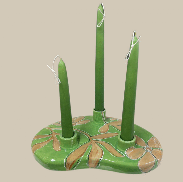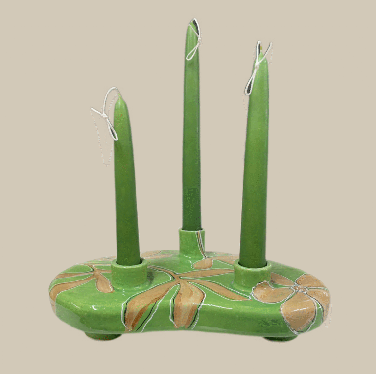 “Tijdens mijn reis naar Marokko raakte ik meteen onder de indruk van alle kleuren en het drukke straatleven. Overal zag ik mensen die nog steeds keramiek met de hand maakten, van grote schalen tot kleine kopjes. Het was zo tof om te zien hoe ze dat met zoveel geduld en vakmanschap deden. Daar kwam het idee in me op om zelf een kandelaar te maken. Terug in Nederland ben ik gaan experimenteren met klei en verf. Ik ben een samenwerking gestart met ambachtslieden in Marokko, zodat zij een eerlijke prijs krijgen voor hun werk en hun gezin kunnen blijven onderhouden. Zo voelt elk stuk niet alleen bijzonder, maar ook goed.” – Doortje IJpelaar