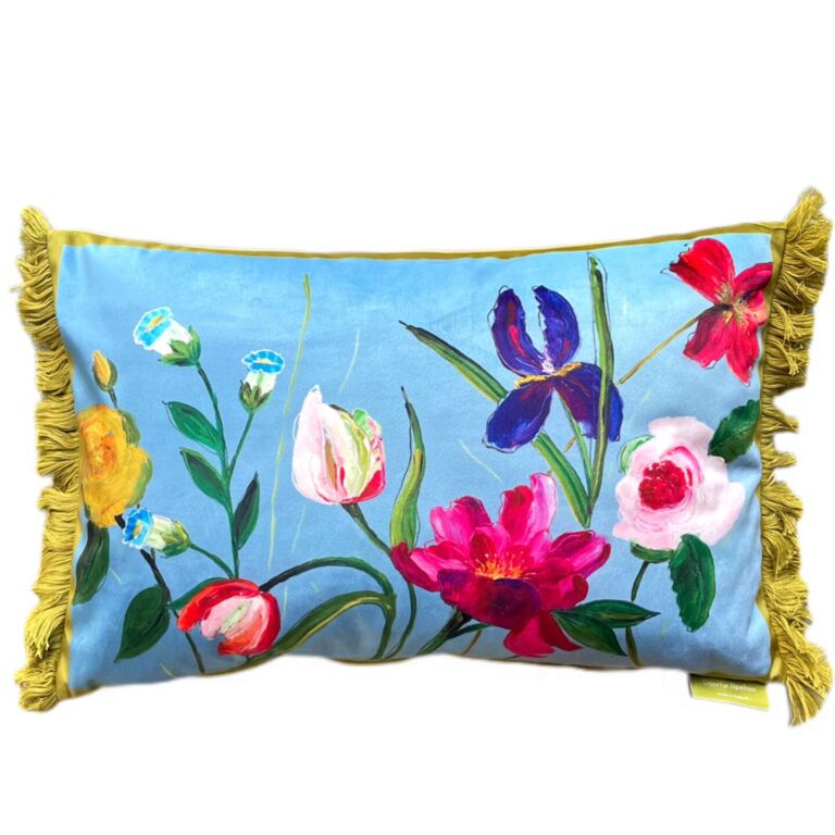 Match dit kussen bij je vaas of  met andere kleurrijke kussens uit mijn collectie. Alle kussens hebben een uni-kleur achterkant, waardoor je leuk kunt afwisselen met de bedrukking. Interessant om te weten is, dat dit kussen een druk is van een geschilderde plaat. De kussens worden gemaakt in Nederland.
