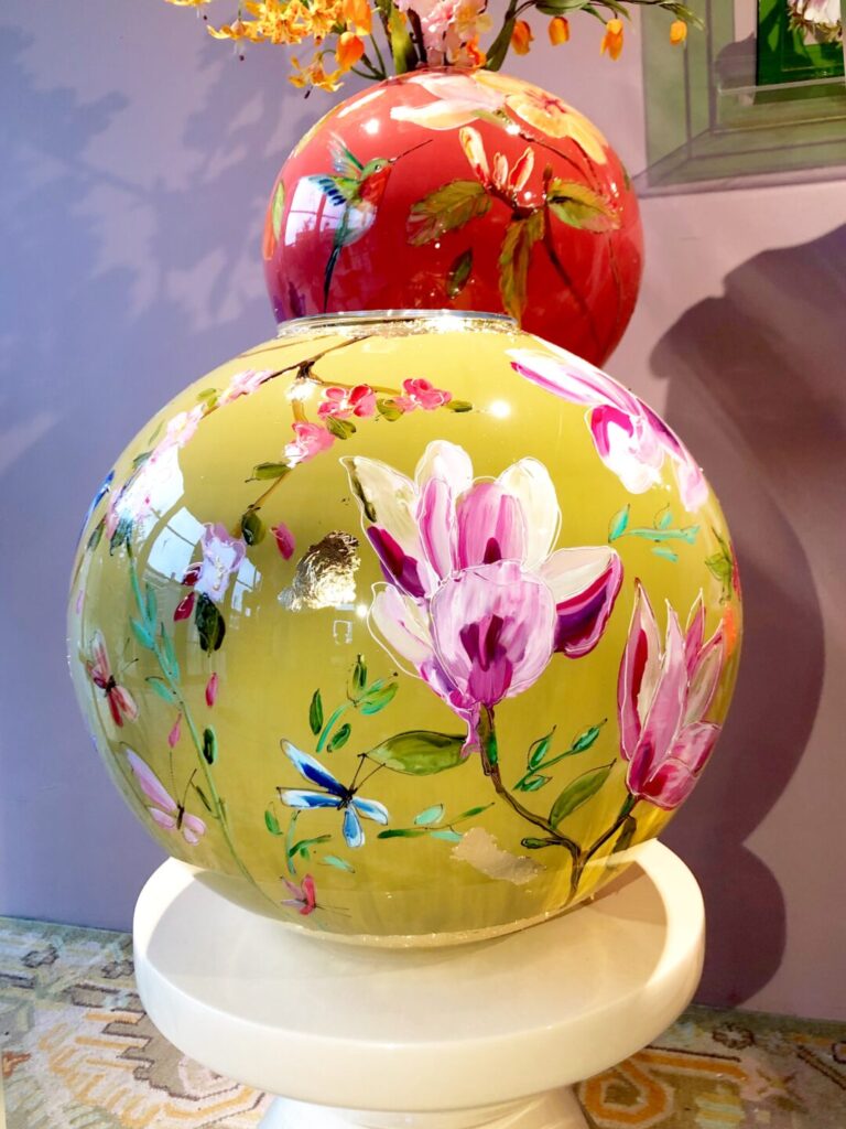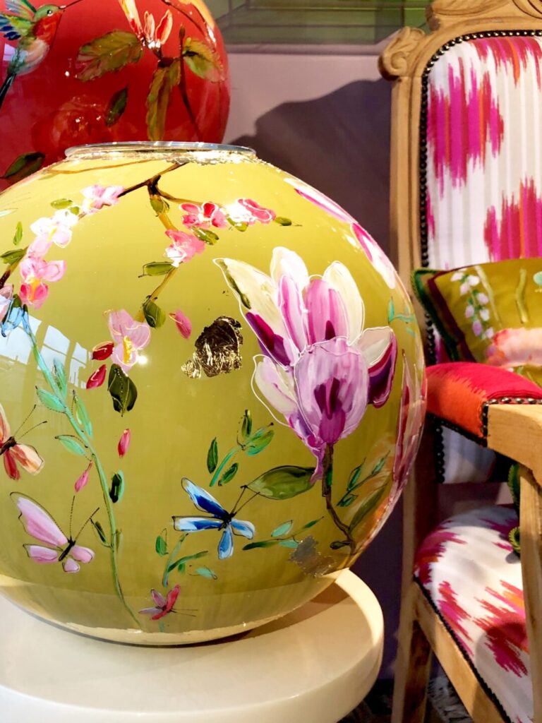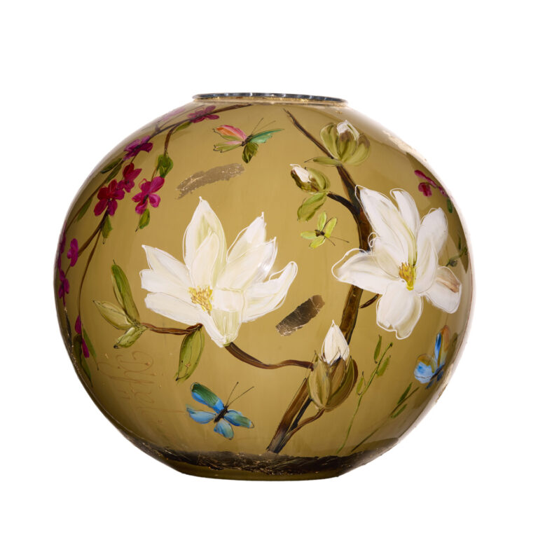 Vaas “Olive Magnolia” uit mijn nieuwste collectie heeft een mooie olijfgroene ondergrondkleur en is beschilderd met roze en witte Magnolia’s, Bloesemtakken, vogels en vlinders. De kleurcombinatie biedt rust, maar de vogels springen er kleurrijk uit. – Doortje IJpelaar