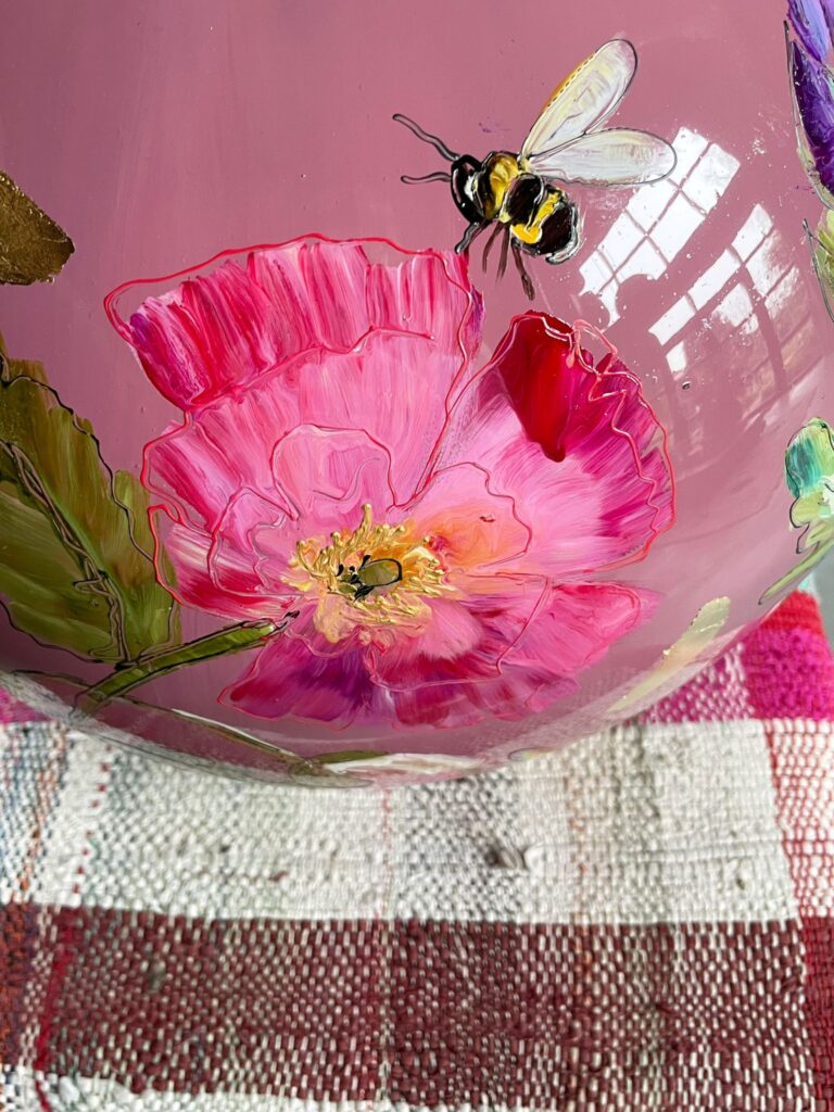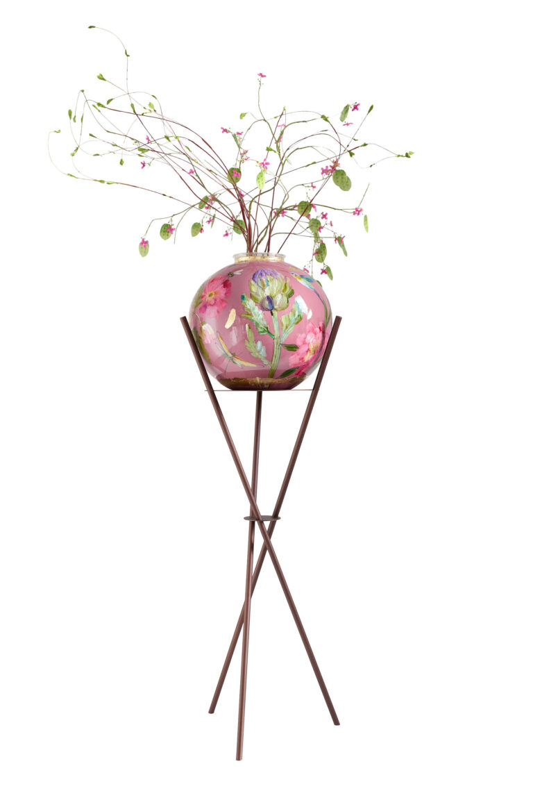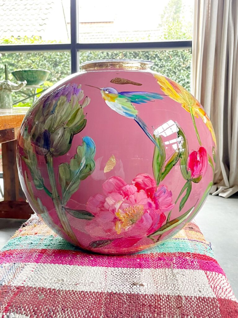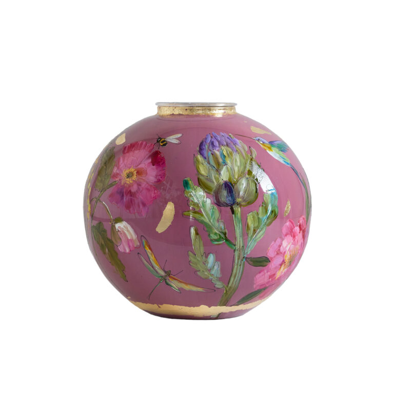 Rosa is een handbeschilderde vaas met een zachte roze ondergrond en rijke bloemdetails. De kleurrijke bloemen, verfijnde insecten en gouden accenten geven haar een dromerige, elegante uitstraling. – Doortje IJpelaar