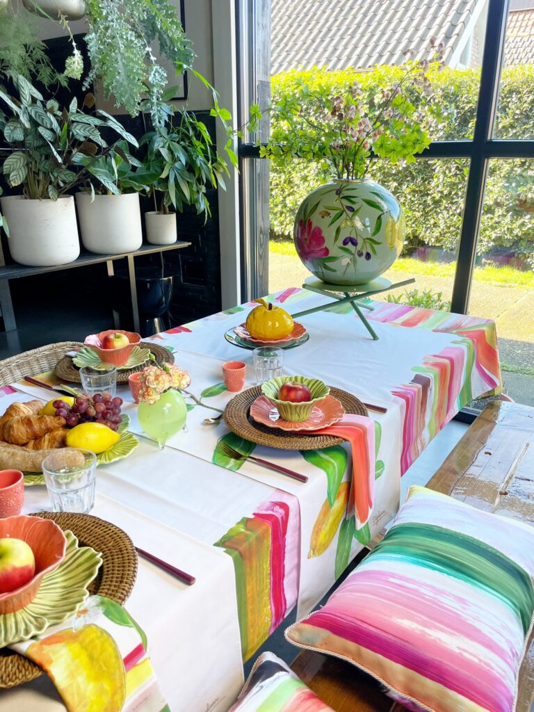 Ik vind het zo leuk dat mijn werk niet alleen aan de muur hangt, maar juist gebruikt mag worden, elke dag opnieuw. Of je nu kiest voor een tafelkleed, een loper of bijpassende servetten, alles vormt samen een vrolijk geheel of voegt iets toe aan jouw bijzondere momenten aan tafel.’ – Doortje IJpelaar