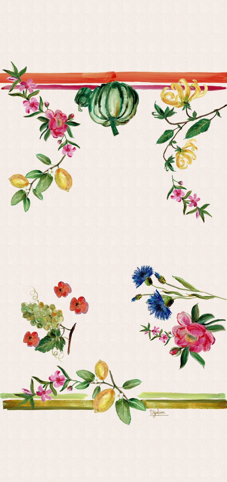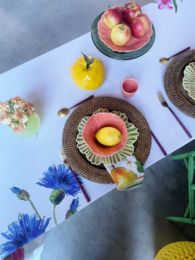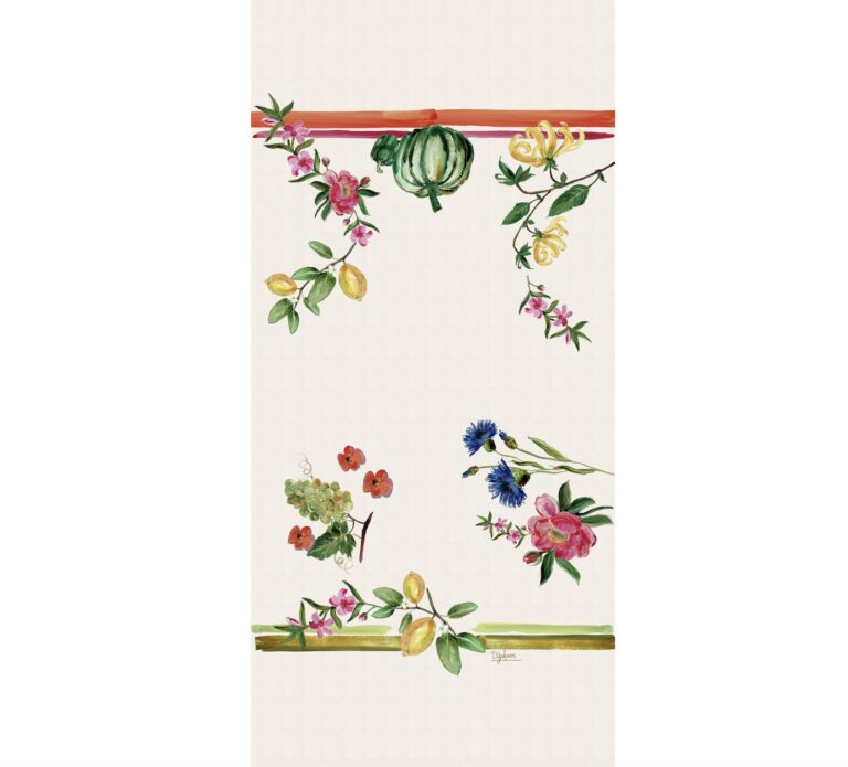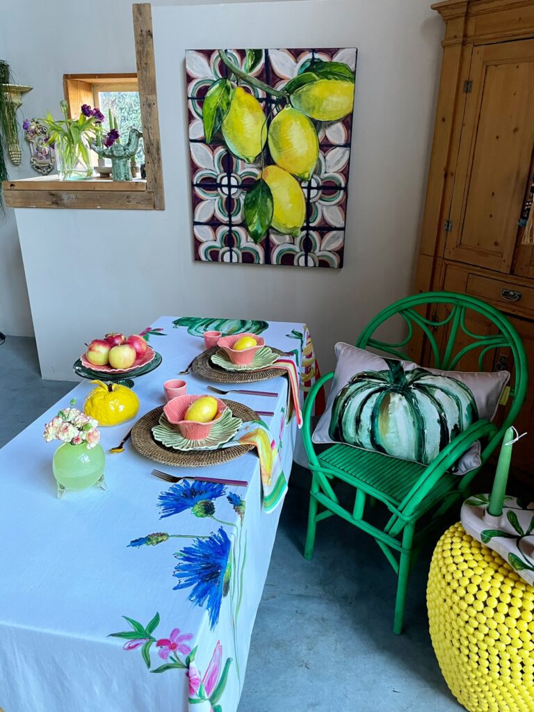 ‘ In dit tafellinnen komen mijn kleurrijke bloemen, groenten, fruit en vrolijke details samen, alsof ik een stukje van mijn kunst naar jouw tafel breng. Als ik ontwerp, laat ik me inspireren door alles wat groeit en bloeit in de natuur om me heen.