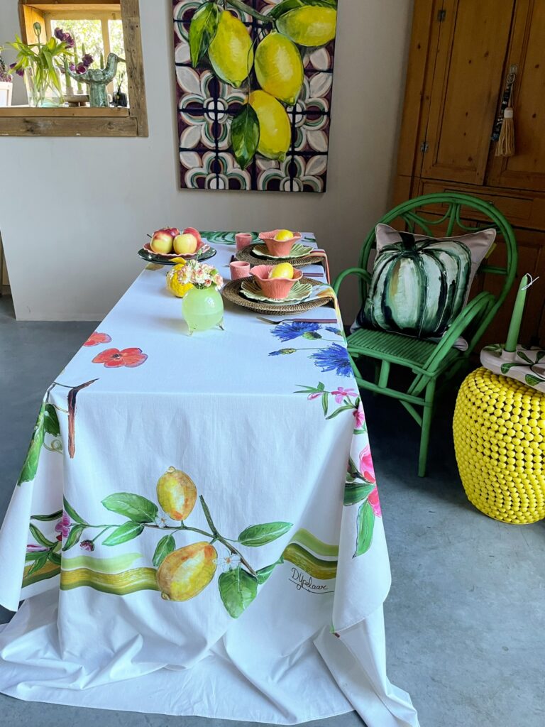 Ik vind het zo leuk dat mijn werk niet alleen aan de muur hangt, maar juist gebruikt mag worden, elke dag opnieuw. Of je nu kiest voor een tafelkleed, een loper of bijpassende servetten, alles vormt samen een vrolijk geheel of voegt iets toe aan jouw bijzondere momenten aan tafel.’ – Doortje IJpelaar