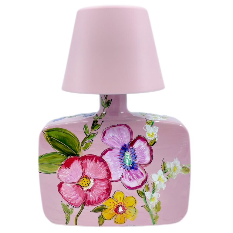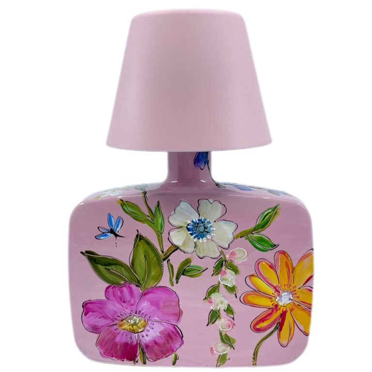 Een door Doortje IJpelaar handgeschilderde gin fles met daarin een lampenkapje met lamp. Het lampje is dimbaar en kan verschillende kleuren licht geven. Het lampje is spatwaterdicht en oplaadbaar doormiddel van een USB-kabel, deze wordt meegeleverd.
