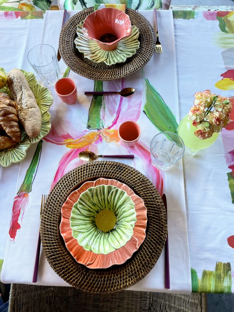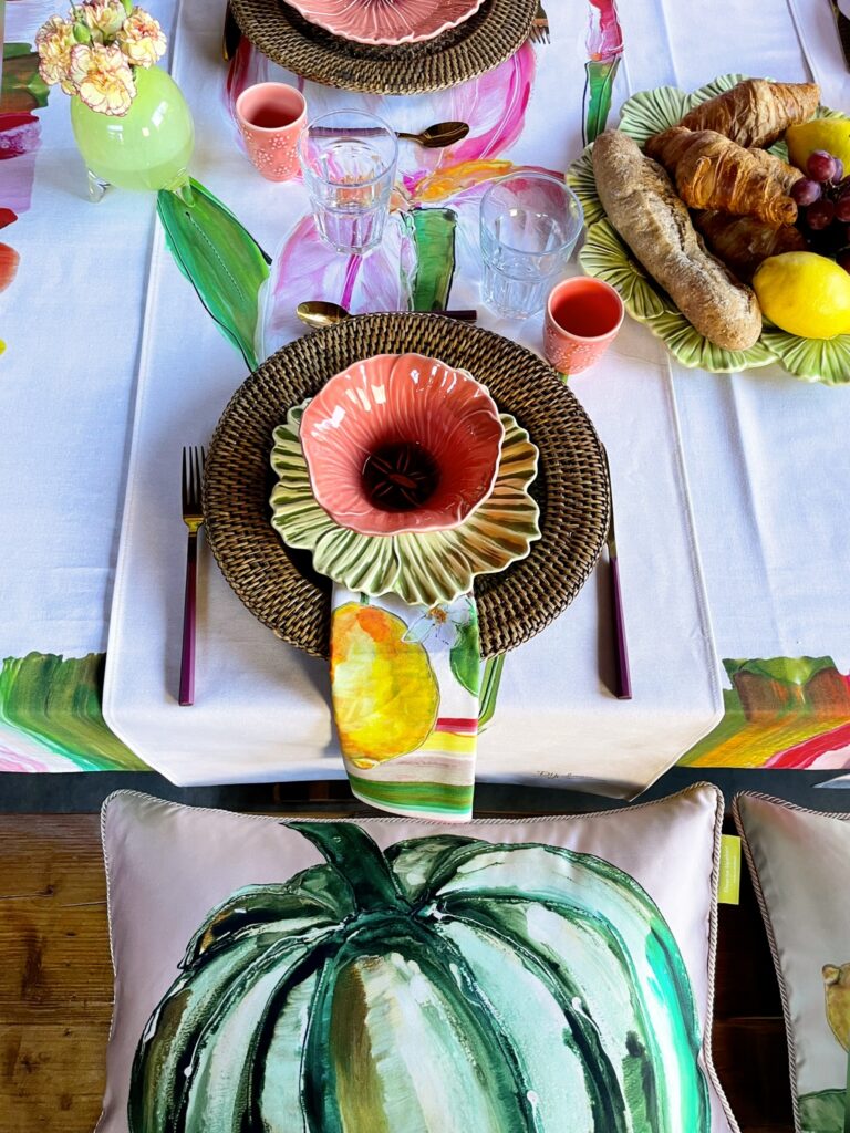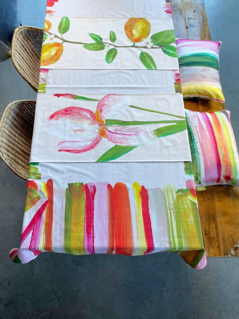 ‘ In dit tafellinnen komen mijn kleurrijke bloemen, groenten, fruit en vrolijke details samen, alsof ik een stukje van mijn kunst naar jouw tafel breng. Als ik ontwerp, laat ik me inspireren door alles wat groeit en bloeit in de natuur om me heen.