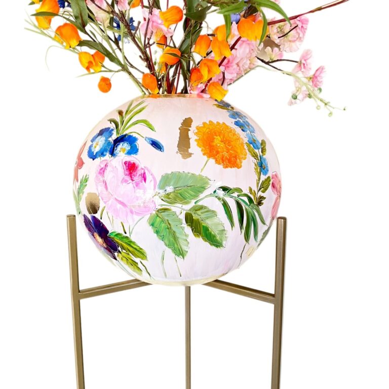 Deze standaard van metaal is speciaal gemaakt voor een vaas van Doortje IJpelaar met een diameter van 38 cm. De standaard heeft een hoogte van 118 cm (46,5 inch) en een breedte van 40 cm (15,75 inch). De standaard is verkrijgbaar in de kleuren Goud en mat zwart.
