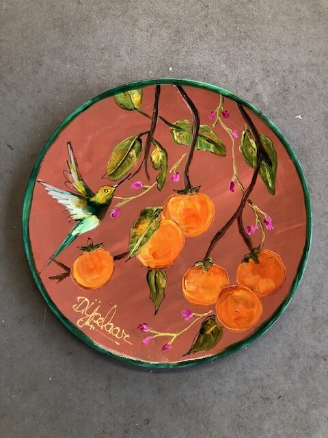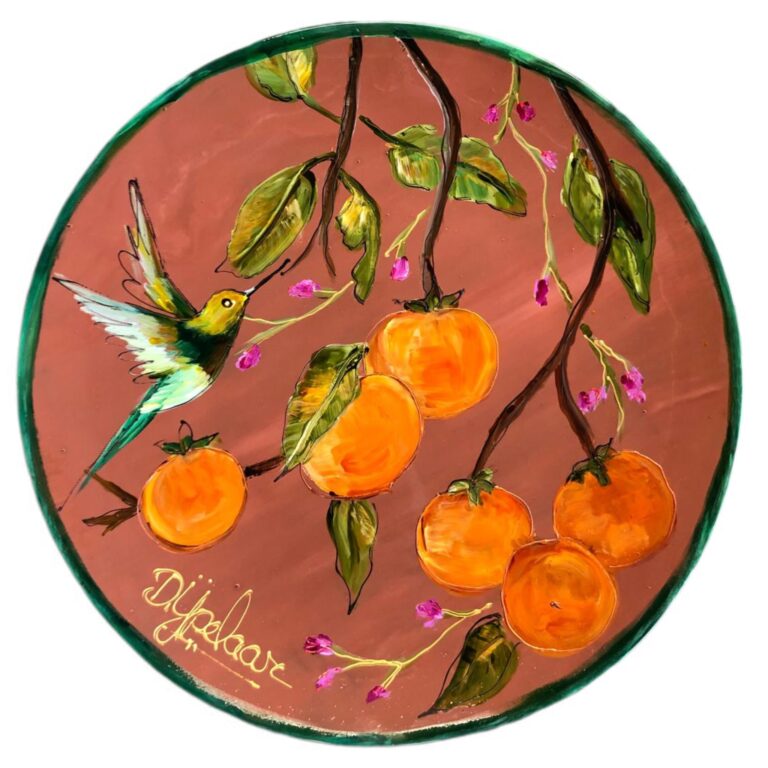 Het wandbord Terra brengt warmte in elke ruimte met zijn terracottakleurige achtergrond. Sinaasappels en een vrolijk vogeltje zorgen voor een speels, natuurlijk accent. – Doortje IJpelaar